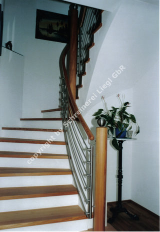 Eichentreppe mit eingestemmten Stufen,  Geländer mit Krümmlingen