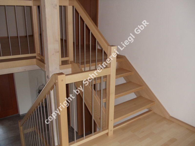 Eingestemmte Buchenholztreppe, Geländer mit Edelstahlstäben